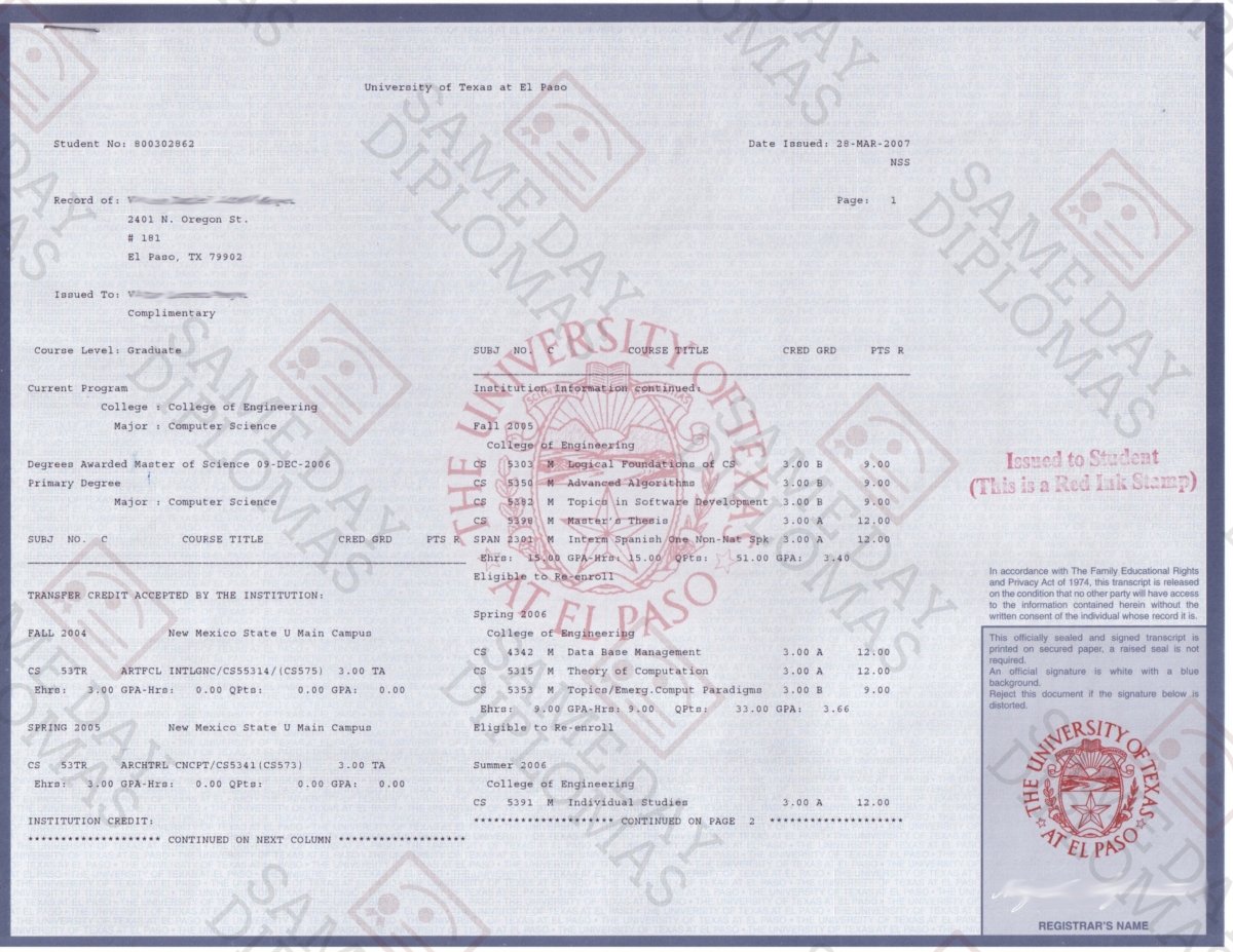 These match Replacement college transcripts look just like the a real one. If we don't have a copy on file we may need one from you. Price starts at 1 page front and back. We will require your course information OR you can opt to use our stock courses.
